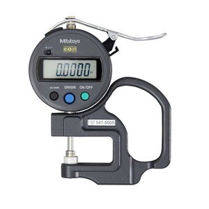 Mitutoyo 547-500S Digimatic Thickness Gage has a Range of .47"/12mm with .0005"/0.01mm Resolution. This model is a Standard Type and reads both inch and metric with a Flat Anvil. These digital Thickness Gages offer a quick and efficient means of inspection with the convenient grip handle, thumb trigger and spring-loaded spindle. Includes SPC data output. The various models cover a wide range of applications.Specifications