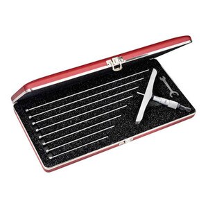 The Starrett 445MDZ-225RL Mechanical Depth Micrometer Set has a measuring Range of 0-225mm with 150mm Base Length and 0.01mm graduations with a Ratchet Stop, Lock Nut and 9 Rods in a padded case. Features a combination ratchet and speeder, for uniform pressure and quicker adjustment. This set allows the depths of holes, slots, shoulders and projections to be measured. The satin chrome reading surface is glare free and resists rust.Specifications