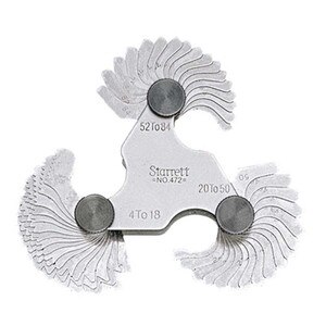 The Starrett 472 Inch Screw Pitch Gage contains 30 leaves with 4 to 84 threads per inch. It also features a locking device and 11-1-2 and 27 Pipe Thread Pitches. Starrett screw pitch gages are among the most useful tools in any mechanics' tool box. They quickly determine the pitch of various threads. These gages consist of a substantial steel case with a number of folding leaves at both ends, each leaf having teeth corresponding to a definite pitch, marked on each leaf. They are available in a wide Range of sizes with different numbers of leaves in various pitch Ranges with which to gage. V, Unified, American National 60 degree threads, Whitworth Standard 55 degree threads, International Metric Standard 60 degree threads. English and Metric threads are similar in form, but English threads are described in threads per inch and metric threads by the distance from one crest to the next. All Starrett screw pitch gages (except 476 and 476, which have a positive stop design) feature a locking devices at both ends of the case, so leaves can be securely locked in position for use. Leaves on most gages have a special narrow design, permitting checking internal threads in nuts, etc. as well as external threads.Specifications